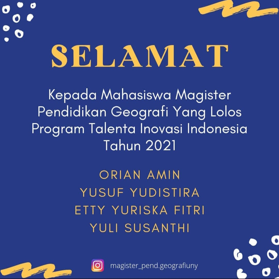 Selamat kepada Mahasiswa Magister Pendidikan Geografi UNY yang telah lolos seleksi Program Talenta Inovasi Indonesia tahun 2021 yang diselenggarakan oleh Direktorat Jenderal Pendidikan Tinggi, Riset, dan Teknologi: