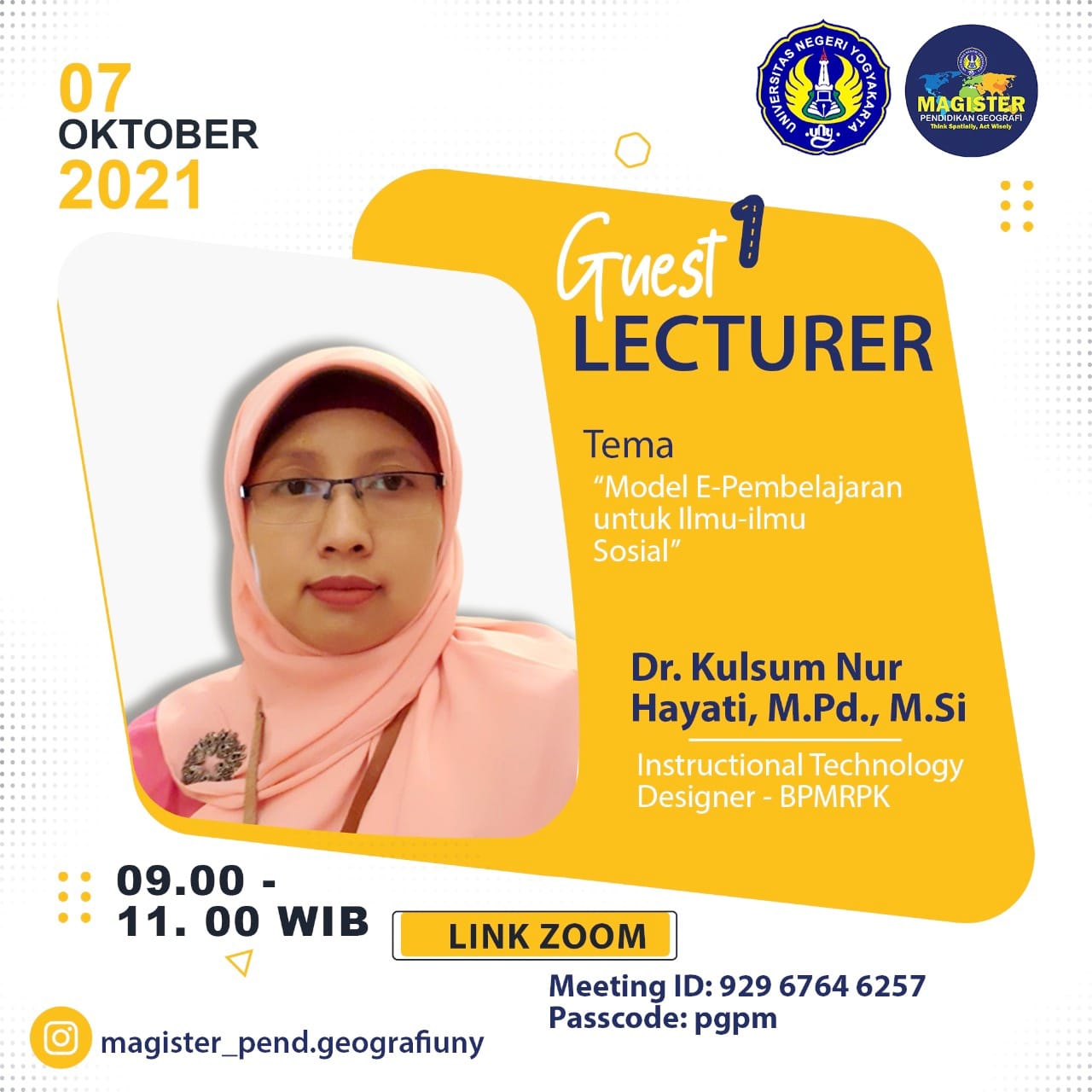 Program Magister Pendidikan Geografi, Fakultas Ilmu Sosial, Universitas Negeri Yogyakarta officially presents: Guest Lecturer Episode 1 dengan tema "Model E-Pembelajaran untuk Ilmu-Ilmu Sosial". Dosen Tamu acara kali ini mengundang Dr. Kulsum Nur Hayati, M.Pd. M.Si (Instructional Technology Design) dari BPMRK. Acara akan dilaksanakan pada hari Kamis, 07 Oktober 2021, pukul 09.00-11.00 WIB via Zoom Meeting.